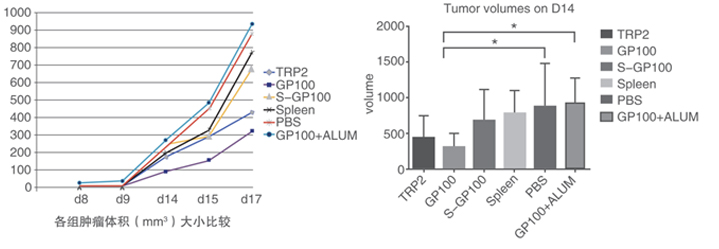 GP100偶聯(lián)細胞組顯著抑制腫瘤生長,與簡單孵育組、PBS組及Alum+GP100組存在顯著差異(GP-100:GP100-偶聯(lián)脾細胞組)