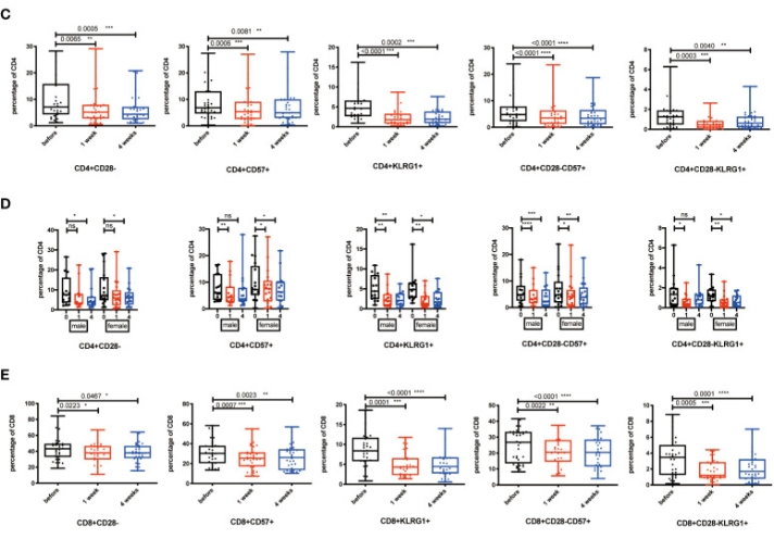 該項研究中一共招募了32名中年健康志愿者,其中32例靜脈注射擴增的NK細胞,5例靜脈注射生理鹽水。然后通過流式細胞術檢測輸注后4周內外周血衰老和耗竭T細胞的變化、衰老相關分泌表型(SASP)相關因子的水平與對衰老或衰竭T細胞的細胞毒活性。