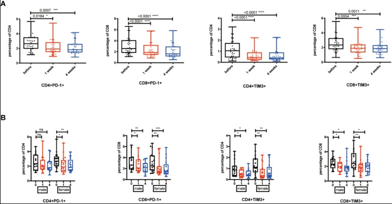 在慢性病毒感染和癌癥的情況下,T細胞會逐漸變得“疲勞”或“耗竭”,使得它們的抗病能力減弱。NK細胞輸注后,研究發(fā)現(xiàn),疲勞的T細胞(包括CD4+和CD8+ T細胞)明顯減少,這表明NK細胞可能有助于恢復T細胞的活力和功能。尤其是在PD-1和TIM-3這類免疫“抑制標志物”表達上,NK細胞輸注后這些標志物顯著減少,表明T細胞的功能得到了恢復。
