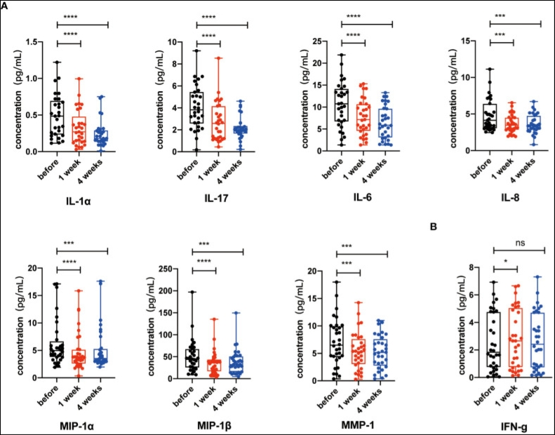 研究人員對輸注前后血漿中的細胞因子水平進行了測量。結果表明,NK細胞輸注后,血漿中的IL-6、IL-8、IL-1α、IL-17、MIP-1α、MIP-1β和MMP-1等關鍵SASP相關因子的水平明顯降低,而非SASP相關因子IFN-γ的水平?jīng)]有發(fā)生顯著變化。