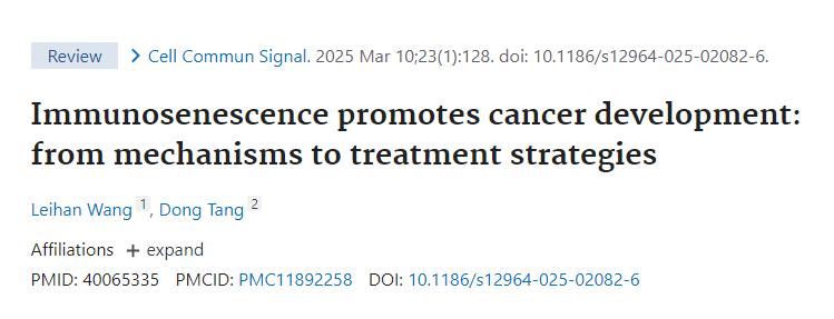 [1]Wang L, Tang D. Immunosenescence promotes cancer development: from mechanisms to treatment strategies. Cell Commun Signal. 2025 Mar 10;23(1):128.