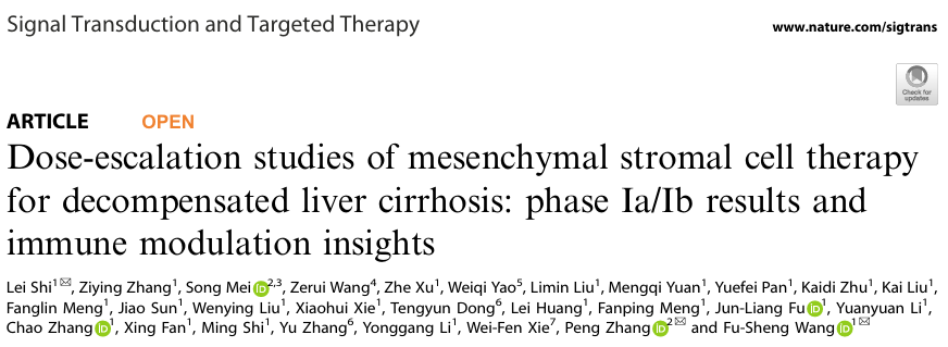 [1].Shi, L., Zhang, Z., Mei, S. et al. Dose-escalation studies of mesenchymal stromal cell therapy for decompensated liver cirrhosis: phase Ia/Ib results and immune modulation insights. Sig Transduct Target Ther 10, 238 (2025).